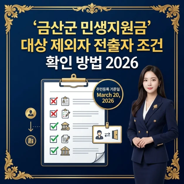2026 금산군 민생지원금 대상 제외자 조건 완전 정리. 3월 20일 이후 전입자·이전 전출자 제외, 사망·주민등록 말소자 제외, 외국인 원칙 제외. 군복무자는 주민등록 기준 수령 가능. 주민등록초본으로 즉시 확인하거나 금산군청 041-750-2114로 문의하세요.